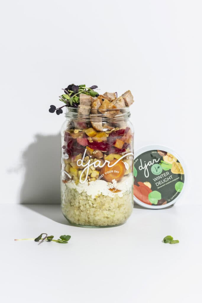 Bloemkoolrijst houdt het gerecht low carb en vezelrijk, terwijl de dressing en wintergroenten zorgen voor balans tussen hartig en fris.